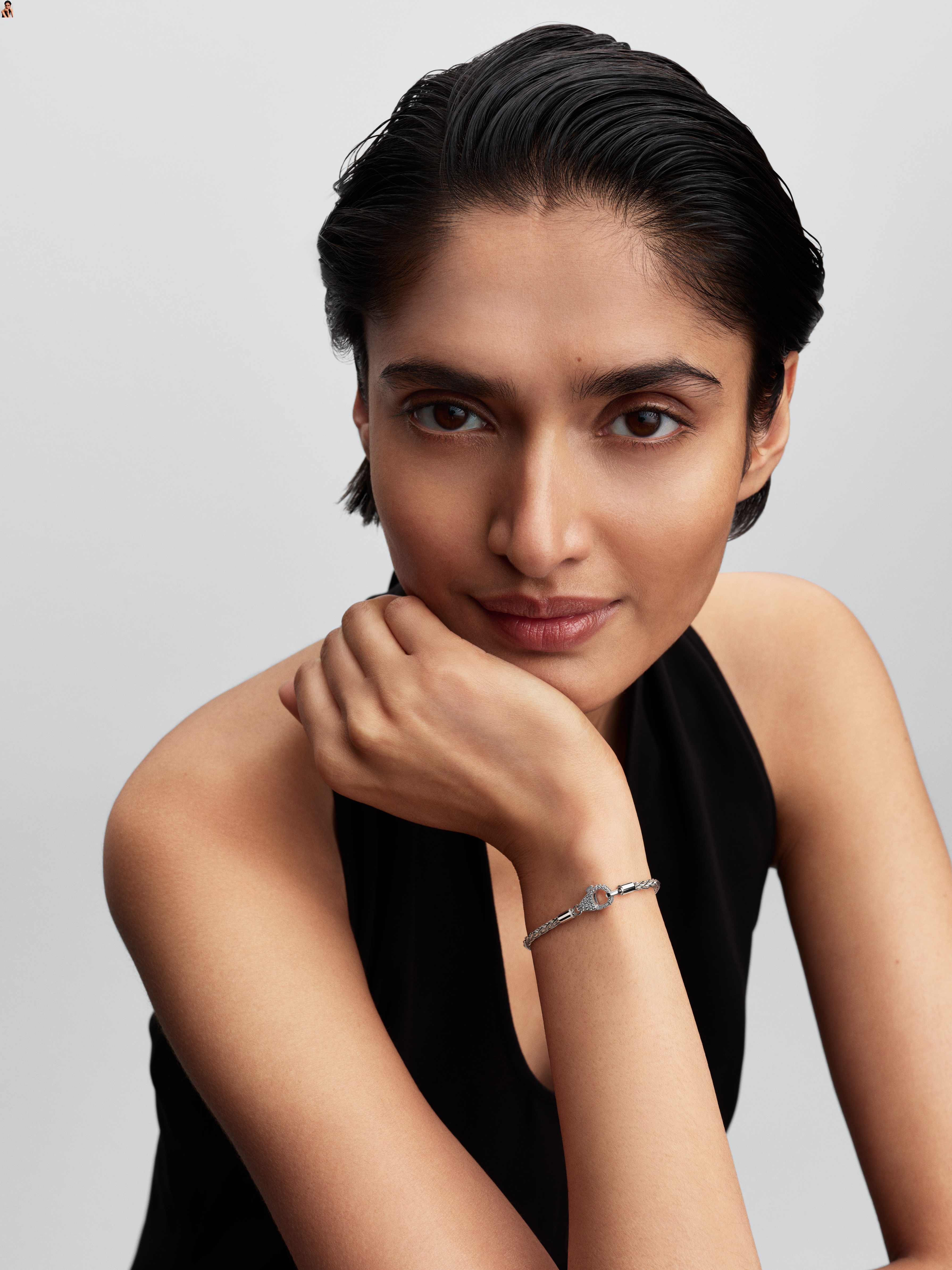 Erzeuge eine Kettenreaktion. Dieses Armband aus Sterling-Silber mit Pavé-Verschluss funkelt mit Schmucksteinen und hat eine zweireihige Fuchsschwanzkette für einen tauähnlichen Look – eine neue Interpretation des