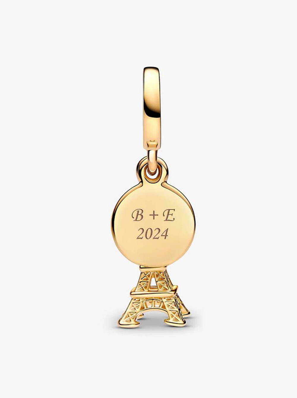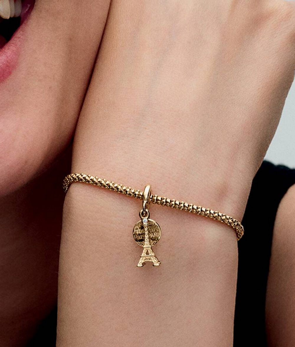 Trage stets ein Stück Paris bei dir. Oben auf diesem Eiffelturm funkelt ein im Labor gezüchteter Diamant. Der zweite Anhänger, eine Scheibe, trägt das Wort „Paris“ und bietet Platz für eine eigene Gravur. Dieses Eiffelturm-Charm bringt französisches Flair in deinen Look.