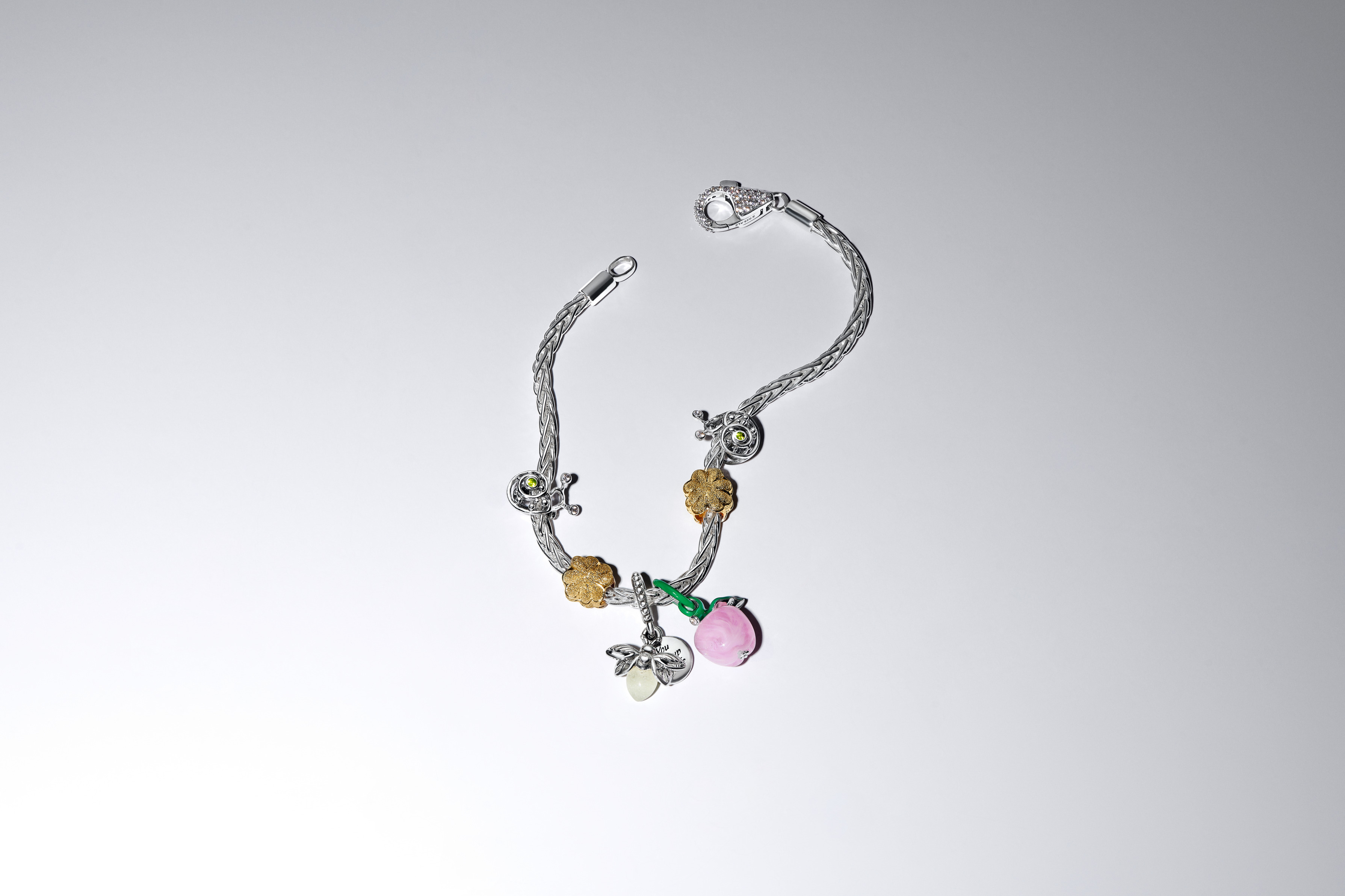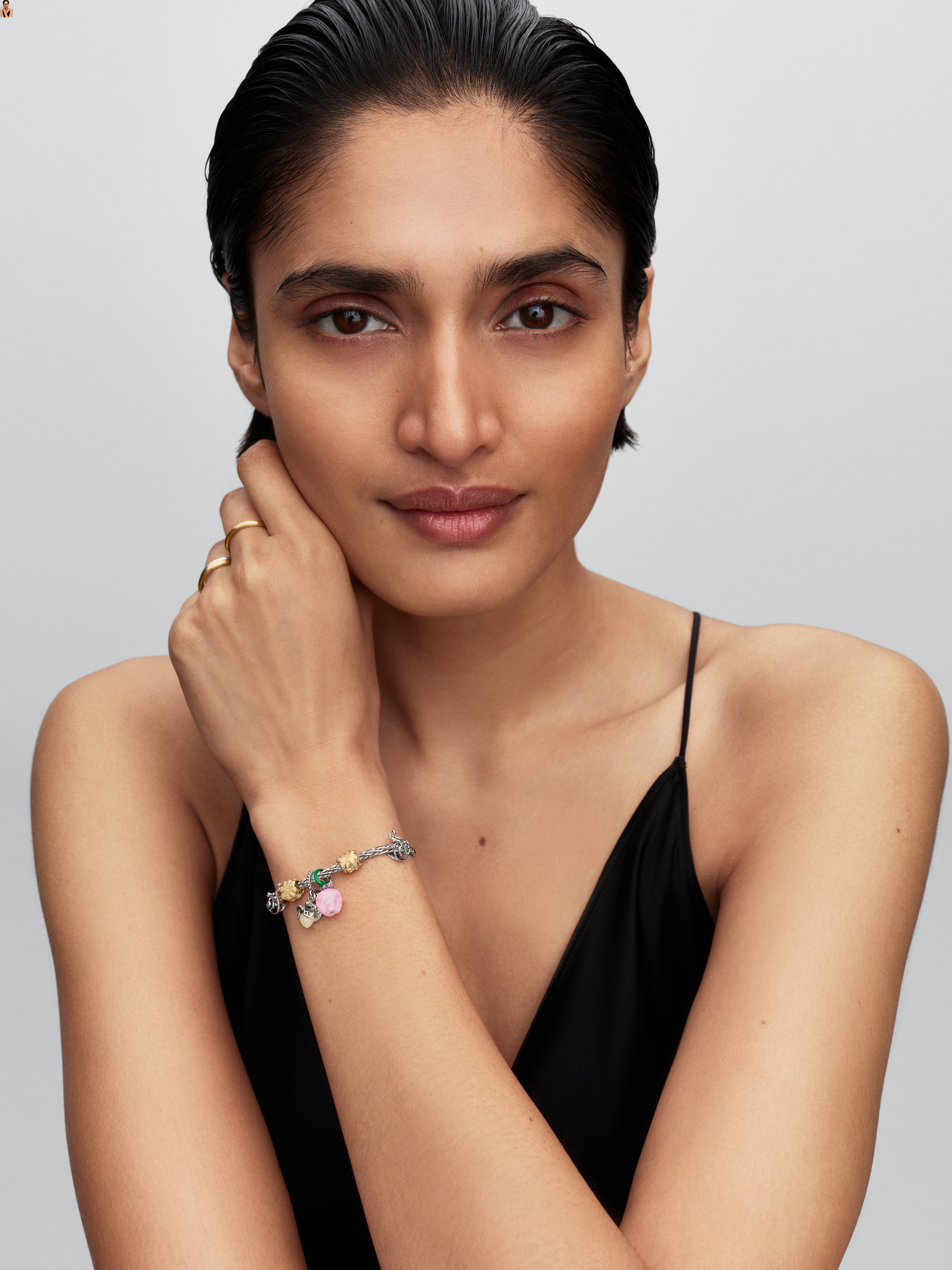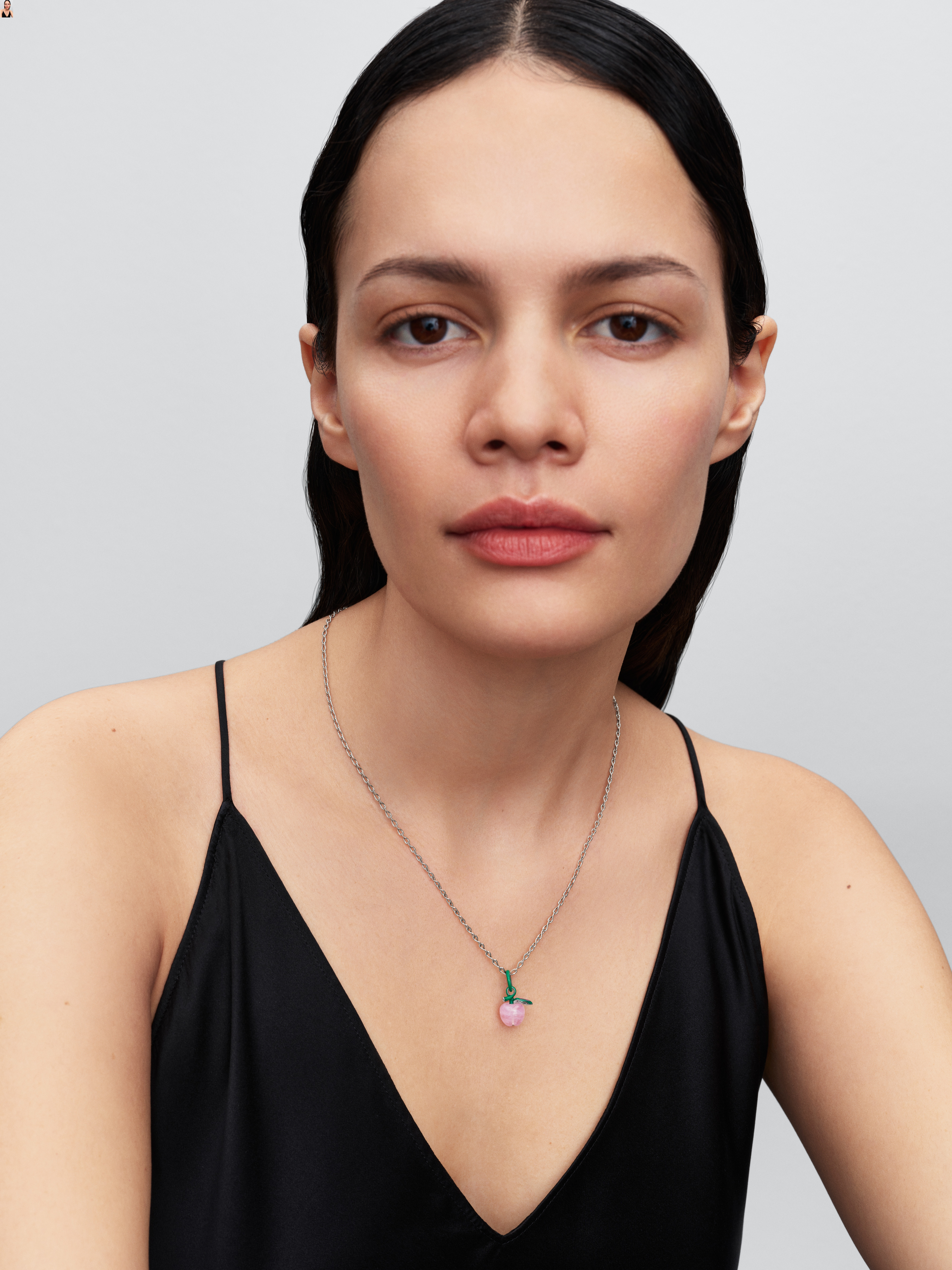 Sterlingsilber, rosafarbenes Muranoglas, klarer synthetischer Zirkonia, grünes Emaille