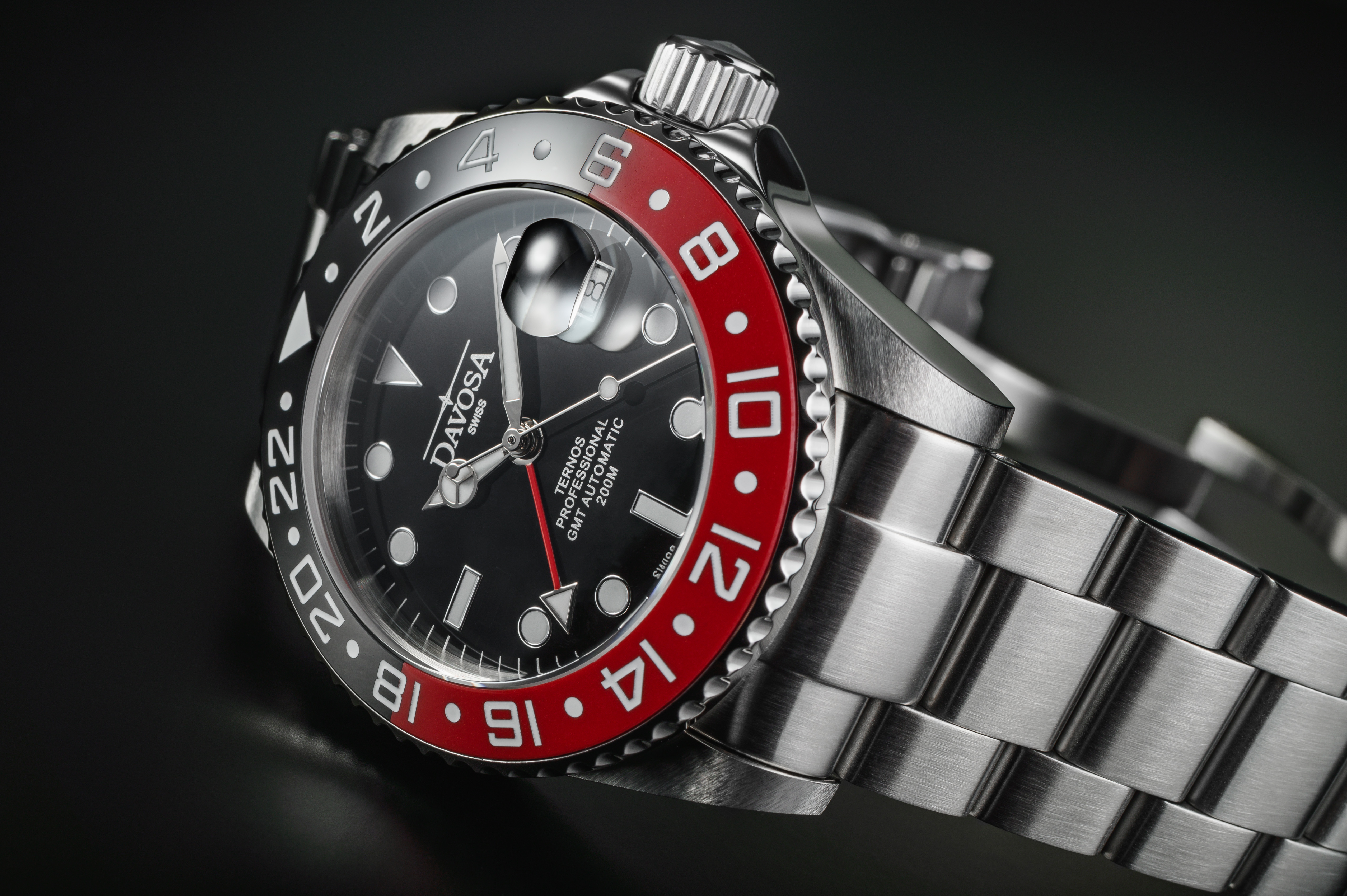 Ternos Professional TT GMT Automatic 161.571.06 Die Möglichkeit, neben der aktuellen Uhrzeit eine zweite Zeitzone anzuzeigen, auch GMT-Funktion genannt, hat sich in den letzten Jahren zu einer der beliebtesten Zusatzfunktionen mechanischer Armbanduhren entwickelt. Für Davosa war es deshalb naheliegend, die erfolgreiche Serie Ternos Professional mit dieser Anzeige auszustatten. Ist die Ternos Professional von DAVOSA doch ein echter Profi, die jeden Taucher mühelos in die Tiefe begleitet und sich nach dem pünktlichen Auftauchen in einen echten Hingucker verwandelt. Bei der GMT Variante befindet sich die 24 Stunden-Anzeige, das Erkennungsmerkmal der zweiten Zeitzone, prominent auf der drehbaren Taucherlünette, die der Ternos ihre charakteristische sportlich-funktionale Anmutung verleiht. Die farbige Einlage der Lünette besteht aus High-Tech Keramik und ist extrem kratzunempfindlich mit einer Härte (nach Vickers) von 1250 HV. Zudem ist sie hitze- und korrosionsbeständig und besitzt durch Hochglanzpolitur eine feine Haptik. Die Herstellung dieser Keramiklünetten ist sehr aufwendig; es ist viel Know-how notwendig, um die verschiedenen Farben in gleichbleibender Qualität und Farbbrillanz zu fertigen. Bisher bot DAVOSA die Ternos Professional GMT in einer monochromen schwarzen Variante und in Kombination mit einem leuchtenden Blau an, aber Fans der Marke wünschten sich weitere Optionen. Nach über 12-monatiger Entwicklungszeit ist es DAVOSA nun gelungen, ein tiefes Rot aus High-Tech-Keramik herzustellen, das sich hervorragend von schwarz bzw. dunkelblau absetzt und dennoch mit den dunklen Nuancen eine dauerhafte Einheit bildet. Die Skala der 24-Stundenanzeige, die aus einem Dreieck, arabischen Ziffern und Punkten besteht, wird anschließend per hochpräzisem Laser in die Lünette eingraviert bevor sie mit Kontrastfarbe verfüllt wird. So entstehen zwei neue Varianten der Ternos Professional GMT TT in rot-blau und rot-schwarz. Das Appendix TT steht bei DAVOSA für Zweifarbigkeit, im Englischen „Two-Tone“. Referenznummer: 161.571.06 EAN: 4060077004468 Anstoßbreite: 22 mm Werk: Automatik, DAV 3032 Wasserdichtigkeit: 20 ATM Lünette: einseitig drehbar, High-Tech Keramik Ziffern: Indexe Gehäuseboden: verschraubt Ausführung: Herrenuhr Kollektion: Diving Gehäuse: Edelstahl Glas: entspiegelt, Saphirglas Funktionen: Datum, zweite Zeitzone Zifferblattfarbe: schwarz Leuchtmittel: SuperLumiNova Band: Metall Länge: 50.4 mm Höhe: 15.5 mm Breite: 42 mm